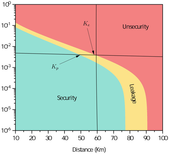 In numerical simulations, we make use of parameters, including attenuation coefficient dB/km, detection efficiency , and so on, which can be usually used performance evaluation of the traditional quantum communication system. As shown in Figure 2, we have the relationship of the secret key rate and transmission distance when considering the leaked lights of the imperfect transmitter. In numerical simulations, the parameters are set as , , , , , , and , respectively. The yellow region is obtained from the difference described as . The derived secret key rate falls within this region only when the leaked light cannot be undetected. This implies that the leaked light has resulted in a potential security loophole, which can be employed by Eve to steal the secret key while performing the intercept–resend attack strategy. As for the red region determined by , the security of the derived secret key rate is not ensured, irrespective of the existence of the AM-involved light leakage.