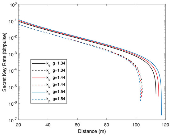In addition, we demonstrate the secret key rate of the the high-frequency AM embedded in the transmitter of the CVQKD system as a function of the transmission while illustrating the effect of the tunable parameter on performance, as shown in Figure 3. We find that there is a decline in the secret key rate with the decreased parameter g. Moreover, the range of the difference region of and , which is called the leakage region, can be extended as the parameter g is enlarged. Namely, the larger parameter g results in the broader difference region for the light leakage. In addition, we find that the smaller parameter g means less information leakage, which leadss to a small security loophole from the high-frequency AM embedded in the transmitter.