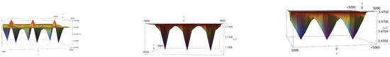 Figure 19 introduces a sinusoidal variation in with , leading to periodic modulations in the waveforms. This sinusoidal factor causes the rogue waves to exhibit a rhythmic pattern in their height and spatial distribution, reflecting the oscillatory modulation imposed by . Finally, Figure 20, with an exponential function defining , shows an intense and accelerating alteration in the wave structures. The waves now display a rapid increase in both the height and complexity, highlighting an exponential sensitivity to the temporal coefficient.