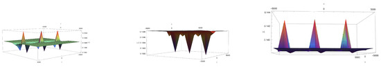 In Figure 17, the linear variation in introduces a scaling effect on the waves and results in a proportionate spatial modulation of the wave features, with each order exhibiting an adjusted pattern that reflects the linear growth of the coefficient. Figure 18 demonstrates the rogue waves under a quadratic coefficient. At the same time instance, the higher-order influence of manifests in a more accentuated transformation of the wave patterns. The first-order waves show a subtle increase in peak sharpness compared to the linear case, whereas the higher-order waves, especially the third-order, display a more pronounced spatial complexity. The crests and troughs become more distinct with increased peak steepness and trough depth, suggesting a nonlinear amplification effect on the spatial features of the waves due to the quadratic nature of .