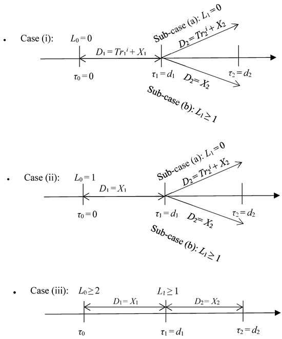 - Case (i), sub-case (b)—a departure occurring at time τ0 leaves no other units behind it, but a departure occurring at time τ1 leaves L1 ≥ 1 units behind it.