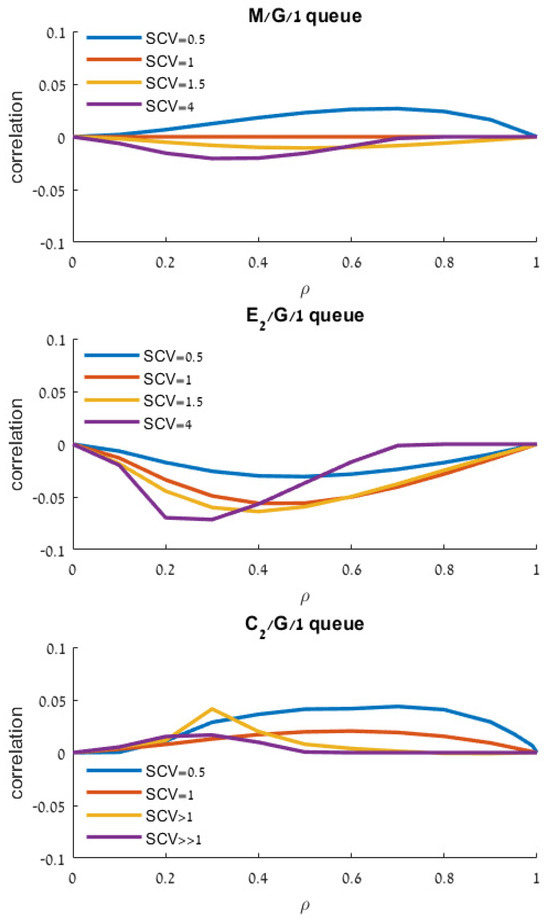 - o In the M/G/1 queue, i.e., when the arrival’s SCV is 1, the service process has opposite impacts on the correlation sign: service distribution with SCV = 0.5 provides a positive correlation, while service distribution with SCV = 1.5 provides a negative correlation. The correlation in the case of SCV = 1 is zero since the departure from the M/M/1 queue is a renewal process.