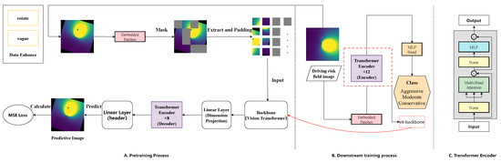As indicated on the left side of Figure 1, in the pre-training phase, we initially apply data augmentation techniques such as rotation and blurring to the input images to enhance the model’s generalization abilities. Once augmented, we mask certain regions of the image to replicate the visual system’s handling of incomplete information. Then, segments from the unmasked image are extracted and processed through the backbone network. We chose the Vit-Base as our backbone network, which employs the self-attention mechanism from Transformers, particularly suited for image-centric tasks. The processed image segments are then passed on to the Header network, a densely connected neural network consisting of multiple dense layers. Each dense layer features neurons tightly interconnected, with each neuron connecting to all neurons from the preceding layer. The Header network is tasked with predicting the content of the masked portions of the image. During this process, the mean square error (MSE) loss between the prediction and the actual image is computed to guide the model’s self-optimization in future iterations. Additionally, in our research on driving style recognition, we recognize that the data augmentation approach differs from that of traditional image recognition. Traditional image recognition mainly focuses on detecting the presence of relevant semantics within the image and emphasizes the extraction of image contour features; on the other hand, driving style recognition is less sensitive to the extraction of image contour features but more attentive to the variation differences between adjacent risk field intensity images and certain statistical parameters. Therefore, data augmentation strategies from traditional image recognition cannot be entirely applicable, and we opt for only those data augmentation strategies that marginally impact semantics. The final determined data augmentation strategy is the application of random rotation and blurring to temporal images. Rotation itself does not affect semantics, so each data augmentation instance includes a random rotation, and the range of random rotation is between −10 degrees and 10 degrees; blurring is randomly applied with a minimal probability and range during the data augmentation process.