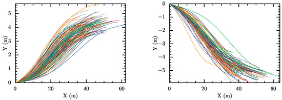 For the experiment, representative left lane change and right lane change data were selected from the dataset. Figure 2 illustrates the trajectory routes of lane change data. In these sets, each line of a different color represents a different lane change trajectory. It is notable that the starting point of each lane change trajectory is located in the very center of the lane, while the end point is the last trajectory point where the vehicle stops after completing the lane change. In establishing the coordinate system, we used the starting point of each lane change trajectory as the origin of coordinates. The forward direction of the lane is defined as the positive direction of the x-axis, and rotating the positive direction of the x-axis counterclockwise by 90 degrees yields the positive direction of the y-axis. Such a definition constructs a global Cartesian coordinate system, enabling us to describe more accurately the position and movement of the vehicles on the road. Additionally, in the data collection experiment, the width of each lane was 4.4 m.