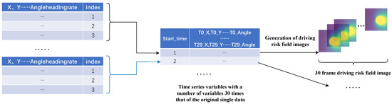 The original dataset has a sampling frequency of 100 Hz, recording data every 0.01 s. Following previous research [13], this experiment uses data collected every 0.3 s as input to discern driving styles. For every 30 raw data entries, 30 images of driving risk fields are generated. The data preprocessing workflow is as shown in Figure 3. Subsequently, the images of driving risk fields are fed into the model for driving style discrimination. Figure 4 illustrates the variation pattern of field strength when both the road boundary risk field and vehicle risk field coexist under different parameters. The field strength generated by both types of fields is vector-based. Directly adding these vectors does not assess the overall level of risk but only the combined field strength of the experimental object in multiple fields. Therefore, a vector modulus superposition method is employed to assess the risk level at a specific point.