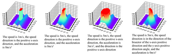 In this context, represents the driving risk generated by object i towards its surroundings, denotes the speed magnitude of object i, , , and are coefficients to be determined, is the angle between the distance vector from the vehicle’s centroid to a certain point around the vehicle and the positive direction of the x-axis, represents the speed difference, a is the acceleration of the vehicle, is the equivalent mass of object i, is the mass of object j, k is the distance vector from the vehicle’s centroid to a point around the vehicle, and is the scalar distance from the vehicle’s centroid to that specific point.