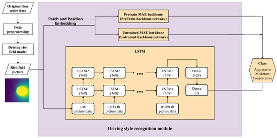 Three models are designed for comparison: MAE-Pretrain, MAE-Untrained (ViT), and LSTM. The ViT model and LSTM model each have advantages in image feature extraction and temporal feature extraction, making them classic benchmark models. Additionally, since MAE, as a training framework, shares the same backbone network and ViT-base network structure, the MAE-Untrained model is equivalent to the ViT-base model. Comparing MAE-Pretrain and MAE-Untrained is essentially comparing the effectiveness of the pre-trained structure of MAE. Long Short-Term Memory (LSTM) [33] is a variant of recurrent neural networks (RNNs) and is a classic model in extracting temporal data features. Moreover, X. Liu et al. proposed using LSTM for driver style recognition [13], demonstrating the effectiveness of LSTM in extracting features from temporal variables.