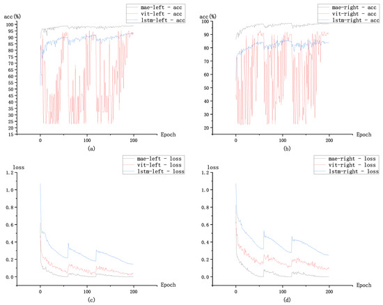 Figure 6 illustrates the accuracy and loss variations during the training process of different models under two operating conditions. Figure 6a,c depict the data changes during left lane change conditions, while Figure 6b,d show the data changes during right lane change conditions. Whether in left lane change or right lane change conditions, the accuracy of the MAE-Pretrain model is consistently higher than that of the MAE-Untrained and LSTM models at any given moment. Based on the statistical data presented in Table 2 and an integrated analysis of the statistical characteristics of left-turn and right-turn conditions, it can be observed that the accuracy characteristics are noteworthy. The MAE-Pretrain model has an average accuracy of around 97%, with peak accuracy consistently exceeding 98%. In comparison to the other two classical models, its accuracy is significantly improved. Moreover, the accuracy curves of the MAE-Pretrain model and the LSTM model fluctuate more smoothly in both conditions, with the MAE-Pretrain model exhibiting greater stability than the LSTM model. In contrast, the fluctuation of the MAE-Untrained model is pronounced. Combining the relevant statistical data from Table 2 and Table 3, it is evident that the range and variance of the MAE-Pretrain model are significantly smaller than the other two models. Additionally, its average accuracy surpasses the other two models, indicating better training stability.