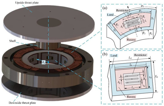 The configuration of the internal feedback hydrostatic turntable. (a) Thrust pad; (b) Journal pad.