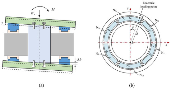 The total load weight on the thrust plate is denoted as Wt, wherein the weight of the eccentric load is Wz. Applying the force translation theorem, the force on the turntable can be resolved into an axial force and an overturning moment, where the overturning moment is Wz × d. Here, d represents the eccentricity distance, and δ is the angle between the eccentric load and the y-axis. In Figure 5, N1–N6 corresponds to the upside pad numbers, N7–N12 to the downside pad numbers, and the oil film thickness hti at any point of the pad on the thrust bearing is expressed as: