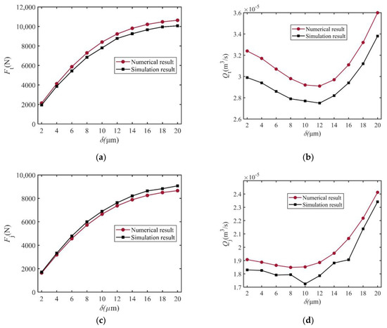 The influence of oil film thickness on work performance under uniform load. (a) Stiffness of thrust bearing; (b) flow rate of thrust bearing; (c) stiffness of journal bearing; (d) flow rate of journal bearing.