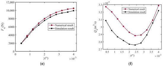 Comparison of simulation and theoretical results. Load capacity (a) and flow rate (b) of thrust pad under uniform load; load capacity (c) and flow rate (d) of journal pad under uniform load; (e) load capacity and flow rate (f) of thrust pad under eccentric load.