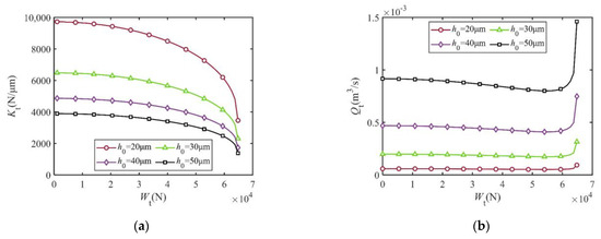 The influence of oil film thickness on work performance under eccentric load. (a) Stiffness of thrust bearing; (b) flow rate of thrust bearing.