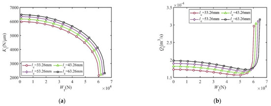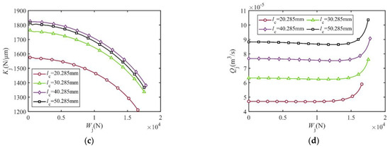 From Figure 22a,b, it is evident that with an increase in the length of the restrictor, overturning stiffness decreases, and, simultaneously, the flow rate increases. For instance, under a maximum load of 8000 N, the overturning stiffness experiences a decrease of approximately 16.7% as Lc increases from 75 mm to 105 mm. Meanwhile, the flow rate increases by a modest 4.1%. Therefore, the increase in the length of the restrictor does not contribute favorably to improving the overturning resistance.