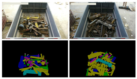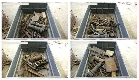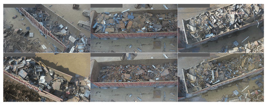 In order to obtain accurate and usable data, we used a scrap steel transport car with dimensions of 3 m × 2 m × 1 m and purchased various types of scrap steel to simulate the recycling operation site. To ensure the accuracy and completeness of the data, we fixed a Hikvision ball camera with a resolution of 1920 × 1080 on a bracket at a height of 4.2 m to 4.5 m. This ensures that the camera can overlook the entire car from all angles, capturing a diverse range of scrap steel images. Figure 1 shows some of the collected scrap steel image samples.