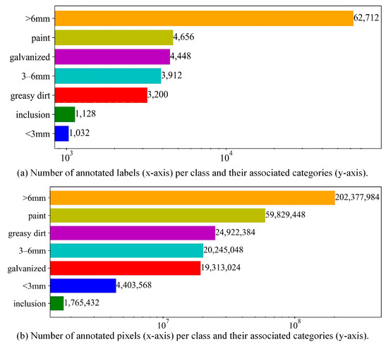 The simulated scenario dataset consists of 1112 images, each with resolution of 1920 × 1080. We divided the dataset into training and validation sets in an 8:2 ratio, with 890 images used for training and 222 images used for validation. The dataset is stored in the PASCAL VOC [27] format. We conducted a statistical analysis of the number of labels and pixels for each category in the dataset, revealing a total of 81,088 labels, with an average of 73 labels per image. Figure 3a displays the number of labels for each category, while Figure 3b illustrates the pixel count for each category. We observe significant variations in the number of labels across different categories, as well as distinct differences in the proportion of pixels occupied by different category labels. Among them, the category with the highest number of labels is “>6 mm” which accounts for 77.34% of the total labels. In terms of pixel count, “>6 mm” also has the highest proportion, representing 60.80% of the total pixels. In contrast, the category with the fewest samples is “<3 mm”, which accounts for only 1.27% of the total labels. The category with the smallest pixels is “inclusion”, representing a mere 0.53% of the total annotated pixels.