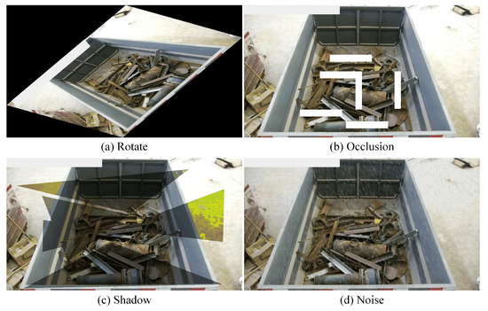 In the real-world environment of scrap steel recycling, capturing images of scrap steel is often subject to a variety of external interferences, such as changes in lighting, physical obstructions, and various weather conditions. These factors not only increase the complexity of image processing but also make the identification of scrap steel features more challenging. To enhance the model’s adaptability to these real-world disturbances, we employed data augmentation techniques to increase the diversity of the scrap steel image dataset. The specific data augmentation techniques applied are as follows: