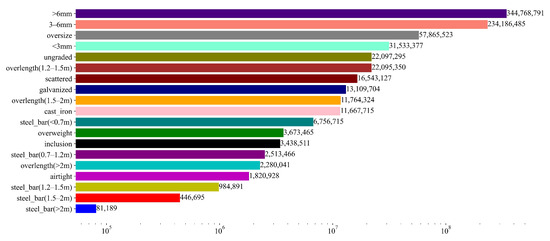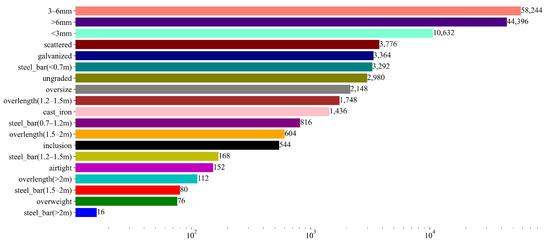 As depicted in Figure 6, there is a notable disparity in the number of labels across different categories. Remarkably, the “3–6 mm” accounts for the largest proportion, making up 43.28% of the overall label count, while the “steel_bar(>2 m)”, with the fewest labels, accounts for only 0.01% of the total. Additionally, Figure 7 depicts the variation in pixel counts for annotations across various categories, revealing significant differences in the volume of pixel annotations among them. Interestingly, while the “3–6 mm” had the highest number of labels, it did not lead in terms of annotated pixel volume. This trend was also evident in other categories, with the “>6 mm” category comprising 43.77% of the total annotated pixel volume.