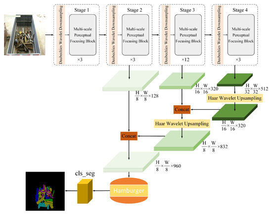 In this section, we provide a comprehensive overview of the WaveSegNet that we have proposed for scrap steel image segmentation. As illustrated in Figure 8, WaveSegNet employs an encoder-decoder architecture similar to previous works. In order to design a powerful backbone network capable of handling complex scrap steel scene segmentation, we incorporate a four-stage feature hierarchy to generate feature maps at different scales. Each stage consists of a downsampling module and multiple MultiScale Focusing Convolution Attention Blocks (MSFCABs).