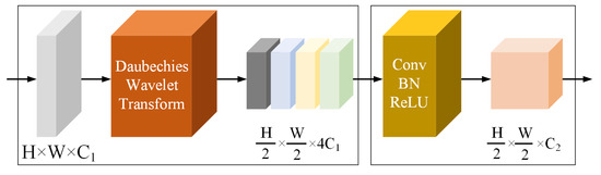 Drawing inspiration from the lossless information transformation method [30], we incorporate the Daubechies wavelet transform in the downsampling module, as illustrated in Figure 10. We refer to this as Daubechies Wavelet Downsampling (DWD), which consists of two components: lossless feature encoding and feature representation learning. For an input feature map of size H × W × C, after the Daubechies wavelet transform, we obtain four components: the approximation (low-frequency) component (A), as well as the horizontal component (H), vertical component (V), and diagonal detail (high-frequency) component (D). The size of each component is W/2 . The Daubechies wavelet transform can encode partial information from the spatial dimension to the channel dimension without any loss of information. Through this transformation, we can concatenate four components along the channel direction, resulting in a feature map of size W/2 . Subsequently, through the feature representation learning part, we aim to filter out redundant information as much as possible, enabling subsequent layers to learn more effective representative features. Furthermore, the channel number of the feature map can be adjusted by manipulating the representation learning block.