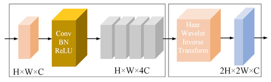 In the field of computer vision research, wavelet transform is widely utilized as a powerful tool for multiresolution time–frequency analysis, particularly in image processing such as denoising, enhancement, fusion, and especially compression. Shin Fujieda et al. [14] proposed a novel architecture, Wavelet CNNs, which combines multiscale resolution analysis with CNNs for image classification and annotation tasks. Liu et al. [15] introduced a MultiLevel Wavelet Convolutional Neural Network (MWCNN), which strikes a better balance between receptive field size and computational efficiency, and applied it to image restoration. Wu et al. [16] utilized MWCNN to train a denoiser that effectively removes Cauchy noise and restores blurry images. To address the performance degradation and excessive smoothing issues when dealing with low-resolution images, Huang et al. [17] proposed a wavelet-based CNN method that reconstructs high-resolution images by learning to predict the corresponding high-resolution wavelet coefficients of low-resolution images. Ma et al. [18] presented iWave, an image compression framework based on CNNs that simulates wavelet transform and achieves improved compression performance in both general and specific texture images. However, unlike the aforementioned works, our approach replaces the traditional upsampling and downsampling with wavelet transform.