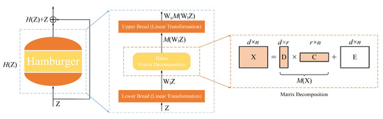 For the feature maps sampled and aggregated at different stages, we use a lightweight Hamburger [31] to further model the global context, resulting in a more comprehensive and representative feature representation. As depicted in Figure 12, the Hamburger consists of three main parts: the middle layer, or the ham layer, which is dedicated to matrix factorization, and the upper and lower layers, collectively known as the bread layers, which perform linear transformations. The lower bread layer transforms the input features into a new feature space , facilitated by the weight matrix . The ham layer then utilizes matrix factorization, denoted by , to further process these features, extracting a low-rank signal subspace and uncovering latent structures within the data. The upper bread layer maps the features processed by the ham layer back to the original feature space through another linear transformation, represented by the weight matrix . By integrating linear transformations with matrix factorization, the Hamburger effectively extracts features and learns representations.