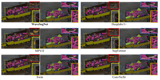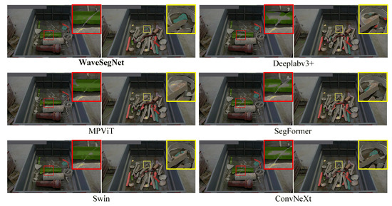 As demonstrated in Table 6, WaveSegNet achieved the highest IoU in both single-scale (SS) and multiscale (MS) evaluations, with results of 69.8% and 74.8%, respectively. This underscores WaveSegNet’s exceptional capability in performing scrap steel segmentation tasks in real-world scenarios. Compared with DeepLabv3+ and Segformer, WaveSegNet demonstrated substantial enhancements in segmentation efficiency, despite possessing a parameter count that is comparable. Specifically, within the single-scale evaluation, WaveSegNet exceeded the performance of DeepLabv3+ and Segformer by margins of 4.6% and 4.1%, respectively. In the multiscale assessment, the respective advancements stood at 8.5% and 4.0%. It is particularly noteworthy that WaveSegNet not only showcases pronounced advantages in terms of parameter count and computational efficiency relative to Swin and ConvNeXt but also excels in segmentation performance. Additionally, the experimental results suggest that MPViT may not be suitable for scrap steel segmentation and rating. In summary, WaveSegNet not only showcases exemplary segmentation performance but also stands out in terms of parameter efficiency and computational economy, revealing its substantial potential in scrap steel image segmentation.