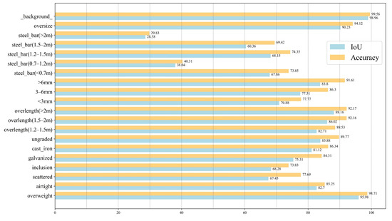 Figure 14 showcases the IoU and Accuracy (Acc) of WaveSegNet for different categories of scrap steel in the segmentation task. Notably, the model demonstrates exceptional performance in eliminating background interference, with the IoU for the background reaching 98.86% and an Acc of 99.56%. For the majority of scrap steel categories, both IoU and Acc exceed 80%, with some categories even surpassing 90%, which emphatically validates the effectiveness and reliability of the model proposed in this study. However, it is important to highlight that certain scrap metal categories, such as steel_bar (2 m) and steel_bar (0.7–1.2 m), exhibit comparatively weaker performance. This is primarily attributed to two reasons: first, the relatively limited sample size of these specific categories in the dataset poses challenges for the model; second, these categories of scrap steel often present as elongated shapes, which lack distinctive features, thereby complicating the segmentation task. In contrast, despite having only 76 annotated samples for the overweight, the model achieves optimal segmentation performance due to its pronounced distinguishing features.