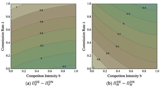 Proposition 5 demonstrates that the manufacturer should encroach when the commission rate is low. This is because when the commission rate is lower, the manufacturer receives a larger share of the agency channel’s revenue and, therefore, has more incentive to encroach. When the platform invests in data analytics capability, expressions for the equilibrium decisions and outcomes are complicated. As such, we performed numerical analyses to compare the equilibrium profit. We illustrate the results using contour plots in Figure 3 whereby, for this particular figure, we set , , and while varying and . Each curve in the contour plot joins points of equal value of either in Panel (a) or in Panel (b). We can observe from Figure 3 that the manufacturer chooses to encroach if the commission rate is sufficiently small, and the platform chooses to allow the encroachment if the commission rate is sufficiently high.