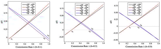 When the commission rate is high, the platform should choose to allow the encroachment, that is, if otherwise. As shown in Figure 4, when the platform invests in data analytics capability, the conditions for the manufacturer to encroach become more lenient, that is, . Therefore, the manufacturer is more likely to encroach when the platform invests in data analytics. The threshold is larger as competition intensity becomes larger, and the threshold and are smaller as competition intensity becomes larger.