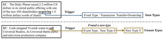 Figure 1 illustrates the task of event detection in zero-shot scenarios (to be formally defined in Section 3). For a seen event, from the sentence S1 “The Daily Planet raised 2.2 million US dollars in its initial public offering with one of the new 600 shareholders acquiring 1.0 million dollars worth of shares”, which is also referred to as an event sample, it is used to identify the event trigger word “acquiring”, and classify the event into type Transaction.Transfer-Ownership. Further, for a new unseen type event, from the sentence S2 “Cash-strapped Vivendi wants to sell Universal Studios, its Universal theme parks and television production company”, it is also used to detect its trigger word “meeting”, but classify it into a new event type N (when there is another event sample of the same type as S2, it will also be put as an event of type N).