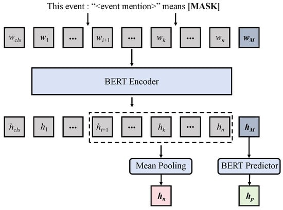 Different from the traditional classification and QA tasks, the purpose of the ER-prompt is to directly obtain sentence embeddings of events by leveraging the predictive capability of the PLM. To assist the model in fully understanding event texts, we have designed an event-specific prompt template “This event: ‘<event mention>’ means [MASK].”, as shown in Figure 4. Here, <event mention> represents the event text, and [MASK] is the sentence embedding that BERT needs to predict. ER-prompt generates two sentence embeddings after input into BERT. The sentence embedding generated from the [MASK] part is predicted by BERT, capturing the overall event information. Like the TR-prompt, we can use Equation (2) to obtain . The <event mention> part generates the sentence embedding directly encoded by BERT, which does not contain any information about the event. To eliminate the influence of the template itself as much as possible, we use the mean pooling of the word vectors of the <event mention> part but not [CLS] marker to obtain :