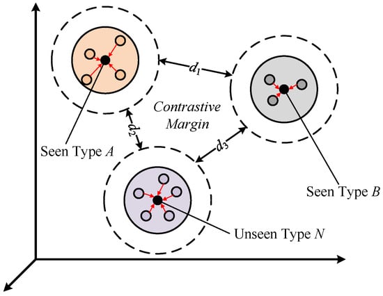 where and represent two probability distributions to be compared, respectively; p is the order, and 1 is taken in this paper. The distance from the four contrastive samples to the original sample is obtained. In order to maintain the partial order relationship of the similarity of ordered comparison samples, that is, for the seen type , for the unseen type , the final ordered contrastive loss function is defined as