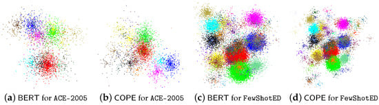 Feature visualization of event representation on ACE-2005 and FewShotED. The four images respectively represent the results obtained by directly encoding two datasets with BERT and the representations obtained by encoding events using the method proposed in this paper.