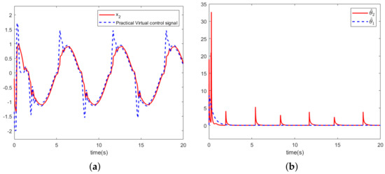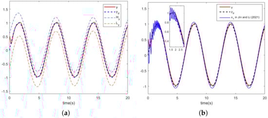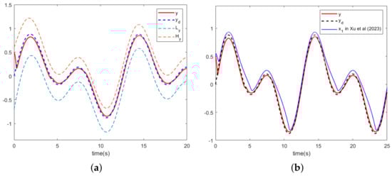 The simulation results in this section are presented in Figure 8, Figure 9 and Figure 10. Figure 8a depicts the trajectory of the system output y, the expectation trajectory . The practical virtual controller of this paper is introduced to the scheme proposed in Reference [27] and then compared with the scheme designed in this paper, as shown in Figure 8b. As can be seen in Figure 8b, the tracking accuracy of the comparison schemes becomes significantly worse when the virtual controller satisfies the corresponding state constraints.