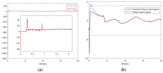 The corresponding system state constraints and tracking error constraints, as well as the system’s initial values and controller parameters, are designed as shown in Table 4. The practical virtual controller is designed as . The relationship between the system input u and the design controller v, i.e., the dead zone and saturation nonlinear models, is described as follows: