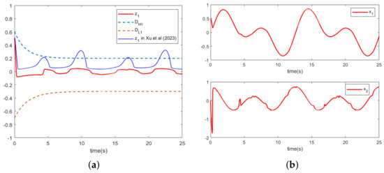Figure 4a illustrates the controller trajectory and the control input trajectory suffering from dead zone and saturation nonlinearity constraints. Figure 4b illustrates the trajectory of the virtual control signal and the practical virtual controller. From Figure 4b, it can be seen that the practical virtual controller designed in this paper adheres to the constraints of the corresponding system states. The problem of is solved. Figure 5a,b illustrates the trajectory of the system state and adaptive parameters . Figure 7 illustrates the output tracking error of the control strategy in this paper and the tracking error of the comparison scheme.