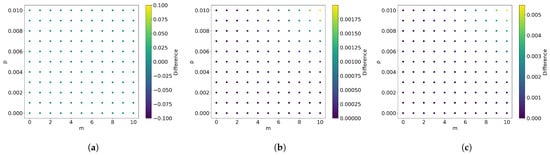 Scatter plots present the difference between the standard channel and modified depolarization channel expectation value. Each channel was applied to a quantum circuit with single qubit gates of 3, 8, and 15, respectively. The result for 3 single qubit gates is presented in plot (a), while plot (b,c) represent the results for 8 and 15 gates circuits, respectively. The x-axis of each plot represents the number of times the noisy channel was applied and is given by m, while the y-axis gives the varying depolarization rates.