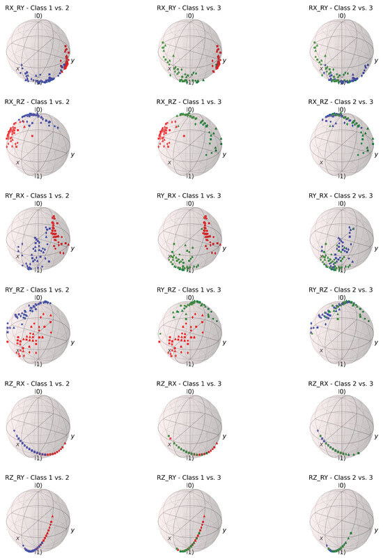 are rotational single qubit quantum gates. We chose the angle encoding scheme because it linearly separates input data in the Bloch Sphere better than amplitude encoding, as shown in Figure 3.