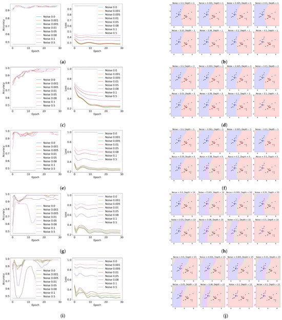 Experimental results for decision boundary evolution presented in the right column and training dynamics in the left column for a QML model on the Iris dataset, with varied noise levels (p) and depolarization channel applied up to (m) times. The decision boundaries are plotted for depths of and 15, at noise levels ranging from to The results across rows are presented in chronological order in circuit depth. Accuracy and loss graphs display the model’s performance over 30 epochs, highlighting the impact of noise rate and circuit depth on learning efficacy.