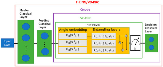 After computation on the quantum node is completed, a measurement is performed. The measurement outcome is the expectation value of a Pauli observable for each qubit. The measurements are passed to the classical decision layer, which makes the final prediction label of the binary classifier. Another architecture explored for this problem area is to append the master classical layer to the quantum layer instead of having it first (i.e., FH:VC-DRC/NN). However, as the performance of the FH:NN/VC-DRC model was superior to that of the FH:VC-DRC/NN model in ref. [27], we only focus on the FH:NN/VC-DRC model. Going forward, we call this the FH model.