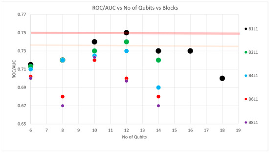 Furthermore, in Figure 3, we see how the ROC/AUC of the FH model’s performance changes with the number of qubits and the number of blocks. For blocks = 1 (black dots), we observe that the ROC/AUC increases up to 12 qubits and then decreases after 12 qubits. The same behavior can also be observed when one increases the number of blocks, with the highest results being achieved with no data-reupload. See the discussion section below for possible explanations.