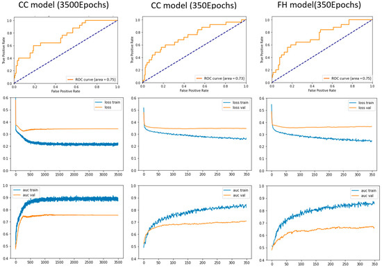 The training processes that produce the highest ROC/AUC scores on the testing dataset are depicted in Figure 4 for both the CC model (left and middle columns) and the FH model (right column). The top row depicts the final ROC/AUC, and the middle and bottom rows show the loss and ROC/AUC training process for the training and validation dataset, respectively. The FH model achieved the highest score, with fewer training epochs for all simulations, shown in Figure 4.