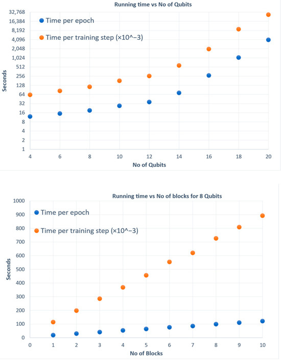 For simulators, we observe the exponential time complexity of increasing the number of qubits and blocks (Figure 5), both of which would not be a problem for a real quantum computer as long as the circuit width (number of qubits) and circuit depth (number of gates) are within the specifications of the quantum computer. However, another general issue for QML is the need to make many executions of the quantum circuit, for 350 epochs and a training set of 1798, this amounts to 629,300 circuit executions. This is not an issue for simulations run on a standalone computer, but for quantum computers accessed on a cloud platform, the overall time taken may not practical; for example, it may take 7 days in total if each execution takes 1 s due to network overheads and queuing time on a shared quantum computer. Quantum computer providers such as IBM allow for paid allotment of compute times and have very recently introduced mechanisms such as Qiskit runtime that enables the execution of the classical and quantum code to be run as one unit, reducing the overall execution time by 120 times, potentially bringing 7 days down to 1.5 h.