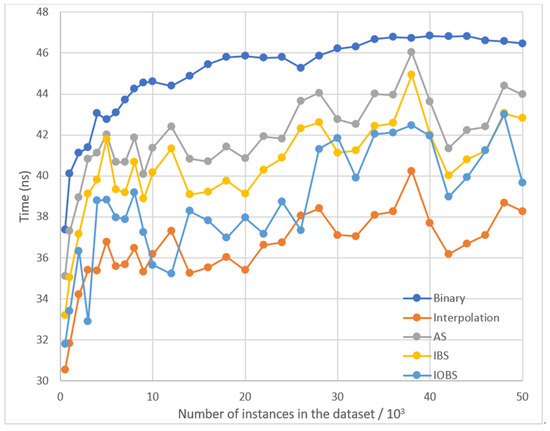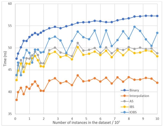 Experimental results also show that Interpolation Search performs best for datasets with uniform distribution. Repeatedly using interpolation to determine the pivot elements for uniformly distributed datasets improves performance. However, it is known that the best-case time complexity of Interpolation Search is O(1) when the first pivot element derived from interpolation is the search key. For uniformly distributed datasets, the first pivot element by Interpolation Search is near the search key, and thus the importance of determining the subsequent pivot elements by interpolation is reduced. How to balance between repeated interpolation and reducing interpolation cost deserves further investigation. For example, although IOBS does not require any parameter, a more versatile version of IOBS could incorporate a parameter to fine-tune this balance, thereby enhancing the algorithm’s adaptability to diverse datasets.