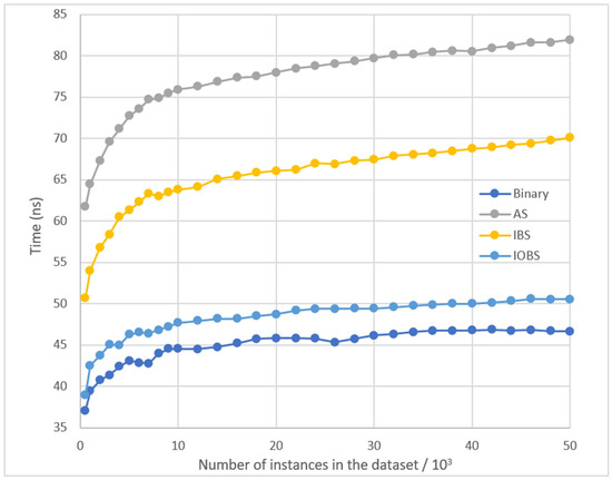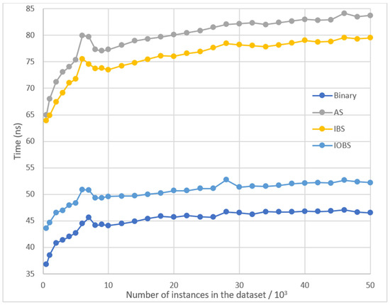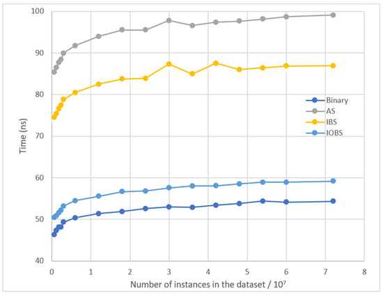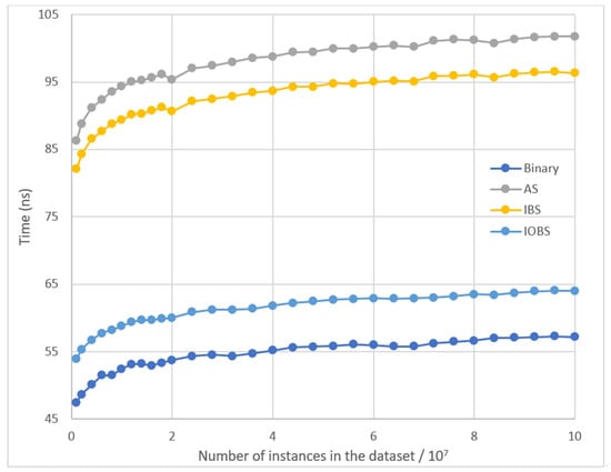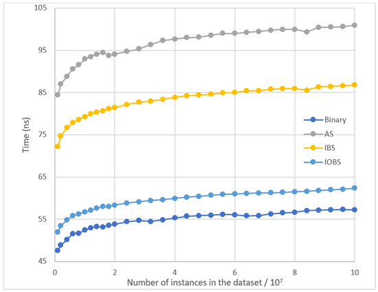 Figure 5 and Figure 6 show the experimental results for small and large datasets with exponential distribution, where the result of Interpolation Search is excluded because of its poor performance and clear demonstration of other methods’ results. Similar to the results for datasets with normal distribution, IOBS consistently outperforms IBS and AS, and achieves performance only next to Binary Search.