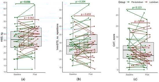 Distribution of participants’ outcomes in the pre-lockdown (n = 22; 23; 24) and lockdown (n = 16; 16; 18) groups: (a) handgrip muscle strength (HMS); (b) number of repetitions in the one-minute sit-to-stand test (1minSTS); (c) points in the COPD assessment test (CAT). Note: p values (p) from Welch t-tests and Mann-Whitney-Wilcoxon tests.