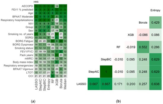 (a) Handgrip muscle strength (HMS) feature’s importance according to LASSO, AIC based stepwise automatic selection (StepAIC), BIC based stepwise automatic selection (StepBIC), normalized entropy (Entropy), random forest (RF), extreme gradient boosting (XGB) and Boruta algorithms in people with chronic obstructive pulmonary disease (COPD) (n = 38). The dark green to white gradient represent the decreasing of the features’ importance. (b) Kendall’s rank coefficient of correlation. The dark green to dark red gradient represent the decreasing of the value of Kendall’s rank coefficient of correlation, with white corresponding to zero. Abbreviations: AECOPD, acute exacerbation of COPD; BPAAT, brief physical activity assessment tool; BMI, body mass index; CCI, Charlson comorbidity index; FEV1, forced expiratory volume in 1 s; FVC, forced vital capacity; LTOT, long-term oxygen therapy; mMRC, modified medical council dyspnoea scale; NIV, non-invasive ventilation; SGRQ, St. George’s respiratory questionnaire.