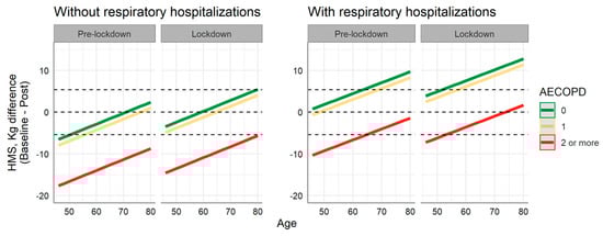 Under certain circumstances, participants with two or more AECOPD tend to improve their upper-limb strength more than the other participants. For instance, they are expected to have, on average, a decreased dHMS by 11.12 kg when compared with participants with no AECOPD (CI95 ≈ [6.36, 15.87]; CI95 is the 95% Confidence Interval), ceteris paribus (everything else remains constant). Participants with respiratory hospitalizations tend to have, on average, an increased dHMS by 7.32 kg (CI95 ≈ [0.88, 13.76]), ceteris paribus. Every year added to a participant’s age results, on average, in an increase of 0.26 kg (CI95 ≈ [0.03, 0.49]) in the dHMS, ceteris paribus. Finally, belonging to the lockdown group resulted, on average, in an increased dHMS by 3.08 kg (CI95 ≈ [0.04, 6.11]), ceteris paribus (Table 2).