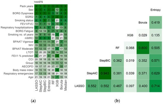 (a) One-minute sit-to-stand (1minSTS) feature’s importance according to LASSO, AIC based stepwise automatic selection (StepAIC), BIC based stepwise automatic selection (StepBIC), normalized entropy (Entropy), random forest (RF), extreme gradient boosting (XGB) and Boruta algorithms in people with chronic obstructive pulmonary disease (COPD) (n = 39). The dark green to white gradient represent the decreasing of the features’ importance. (b) Kendall’s rank coefficient of correlation. The dark green to dark red gradient represent the decreasing of the value of Kendall’s rank coefficient of correlation, with white corresponding to zero. Abbreviations: AECOPD, acute exacerbation of COPD; BPAAT, brief physical activity assessment tool; BMI, body mass index; CCI, Charlson comorbidity index; FEV1, forced expiratory volume in 1 s; FVC, forced vital capacity; LTOT, long-term oxygen therapy; mMRC, modified medical council dyspnoea scale; NIV, non-invasive ventilation; SGRQ, St. George’s respiratory questionnaire.
